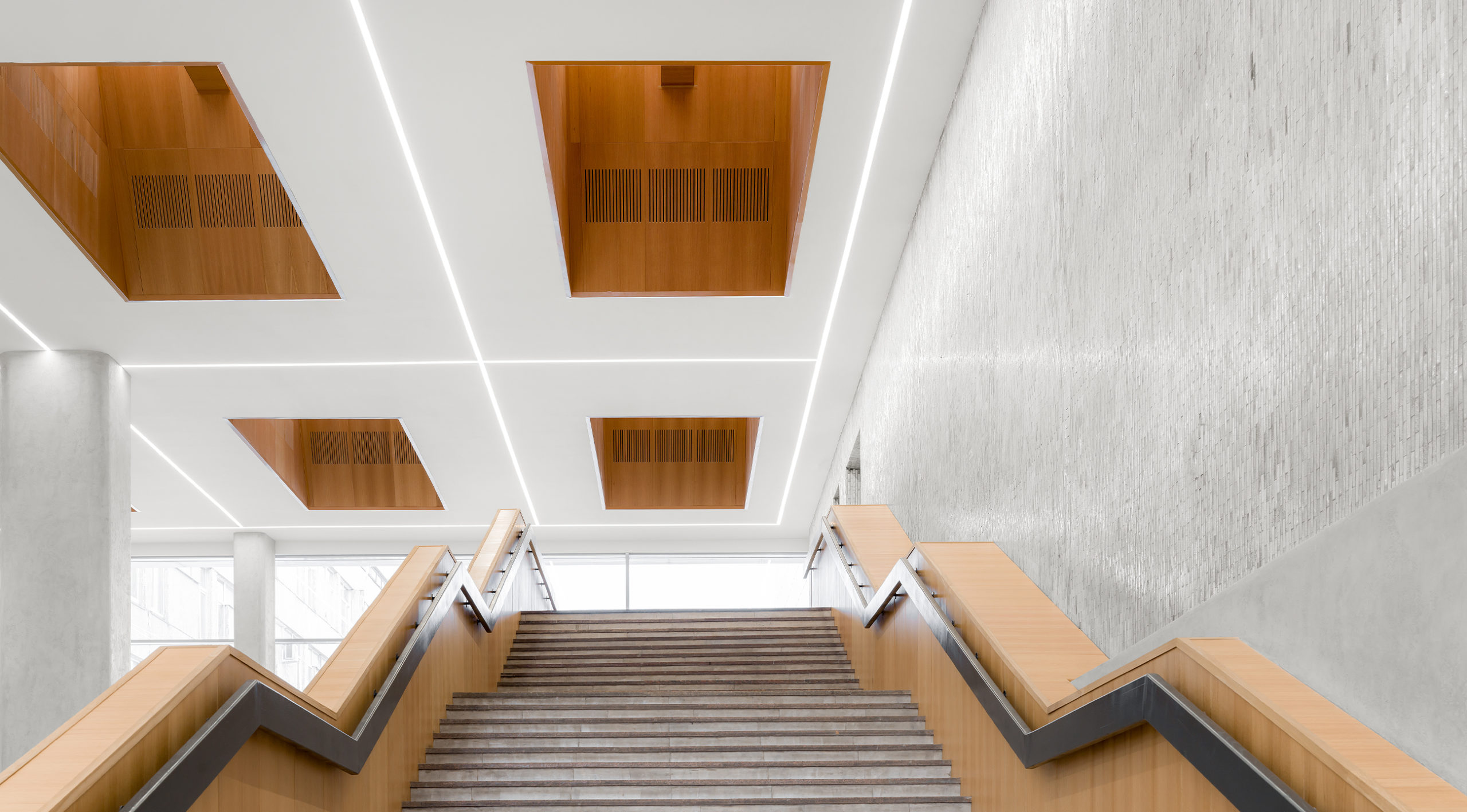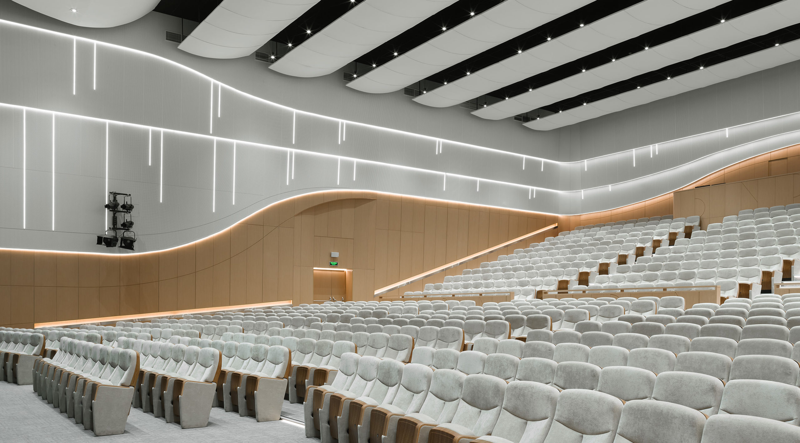 В основе наших решений лежала необходимость сформировать представительное пространство, но без лишнего пафоса, с демократизмом, присущим студенчеству. Отсюда сочетание монохромных текстур со светлым дубом. А акустический расчёт показал необходимость использования меланиновых “парусов” на потолке и оснащения части панелей микроперфорацией.