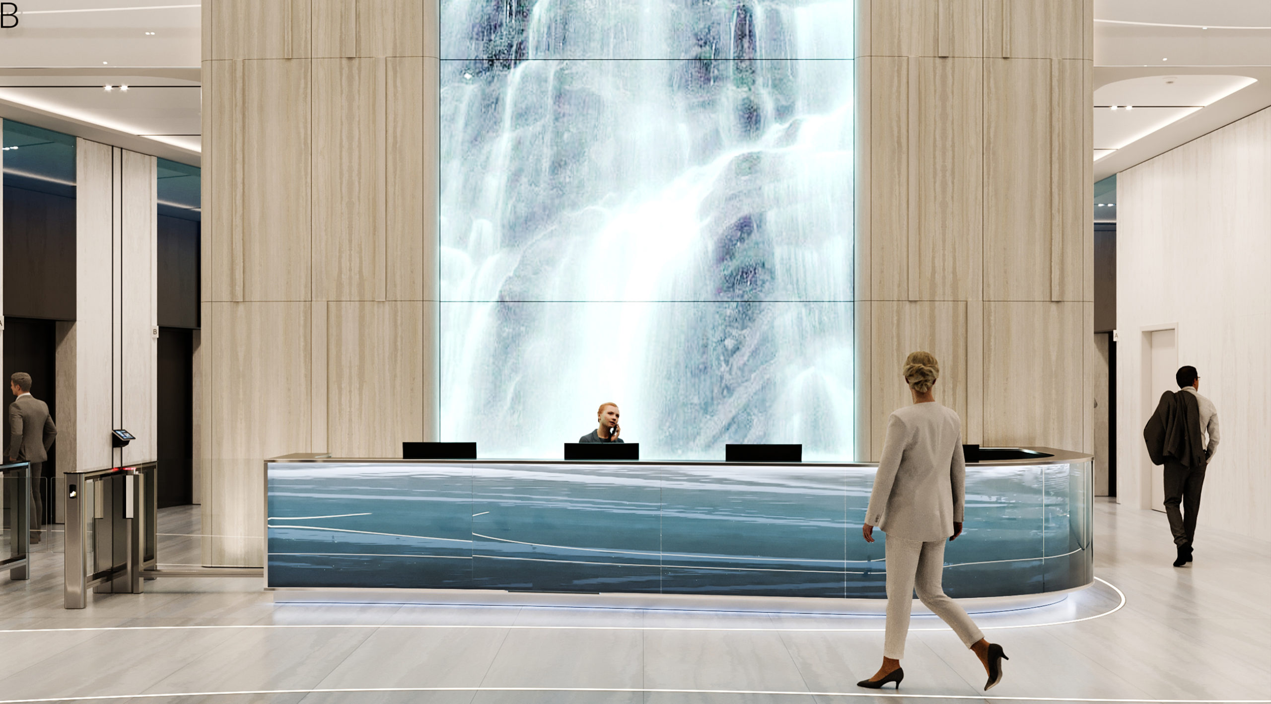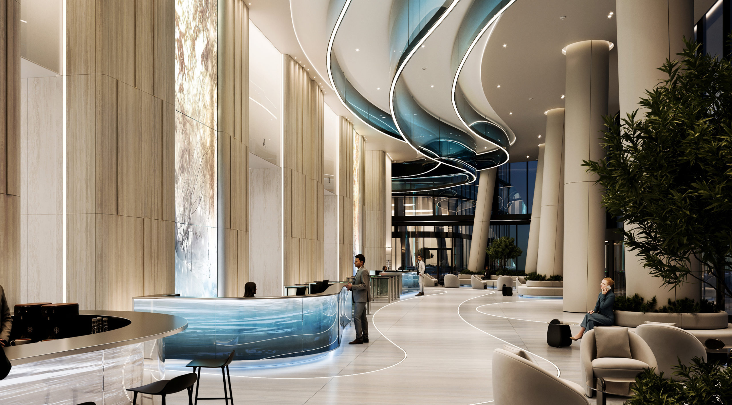 The space is organized according to the same principle of functional zoning: comfortable waiting areas with low sofas organically coexist with green islands, and light lines on the floor gently direct the flow of people. However, the layout of the second building offers a more intimate atmosphere due to the change in proportions and the introduction of additional textures – for example, wooden panels with a vertical rhythm, which visually increases the height of the room. The media screen here does not simply duplicate the function of the first building, but works as an art object that transforms the space: depending on the time of day, it can become a mirror surface reflecting the interior, a source of soft lighting, or a platform for digital installations.