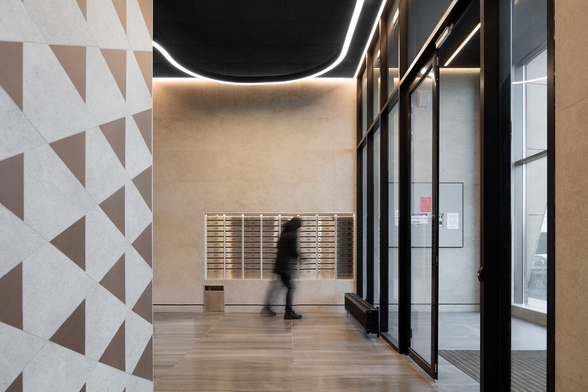 The lobby of the main entrance has an area with mailboxes and a lounge area with a long sofa in front of a large stained glass window. The main background of the interior is ceramic granite from Kerama Marazzi. We used the Roverella collection, which has natural shades and textures. One of the most striking design solutions, recognizable throughout the buildings of the complex, is the geometric pattern of polished metal panels. It meets visitors at the entrance and changes depending on the color scheme of the block.