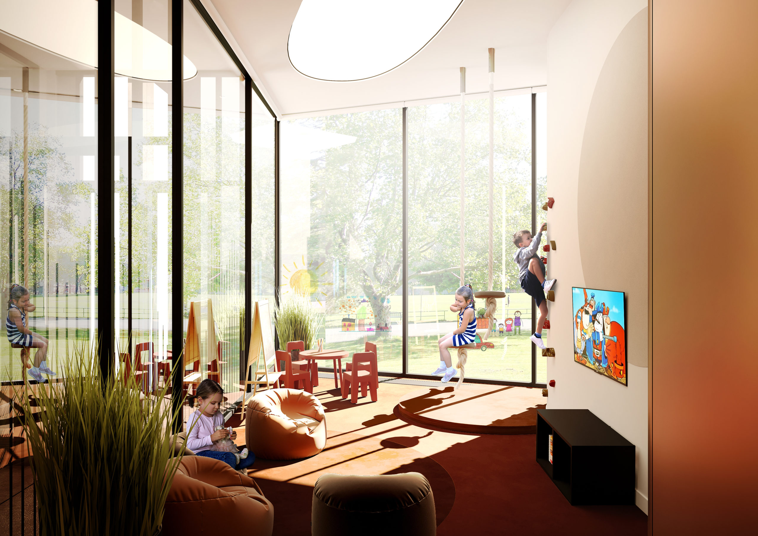 Все пространство погружено в теплые, песочные тона с коралловыми акцентами. Зоны также связаны между собой кривой на полу, которая интуитивно подсказывает, куда можно идти.