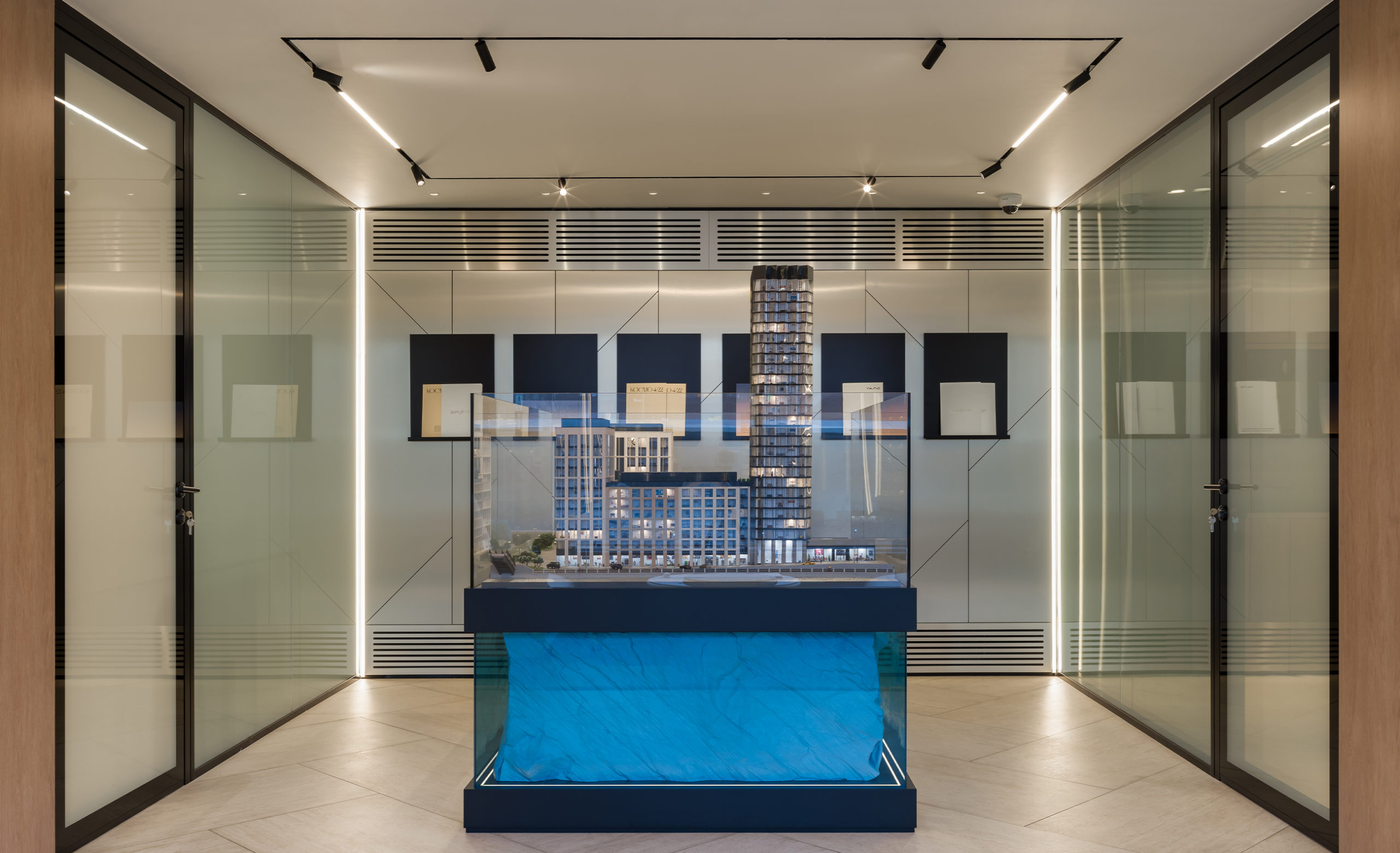Сам макет и его стойка — наравне главные точки притяжения со входной зоной. Поэтому, было принято решение использовать активную скалистую фактуру из белого гипса под градиентным стеклом на обеих стойках. Яркий голубой цвет, используемый в стекле, дополнительно акцентирует пространство и отражается в стеновых металлических панелях.