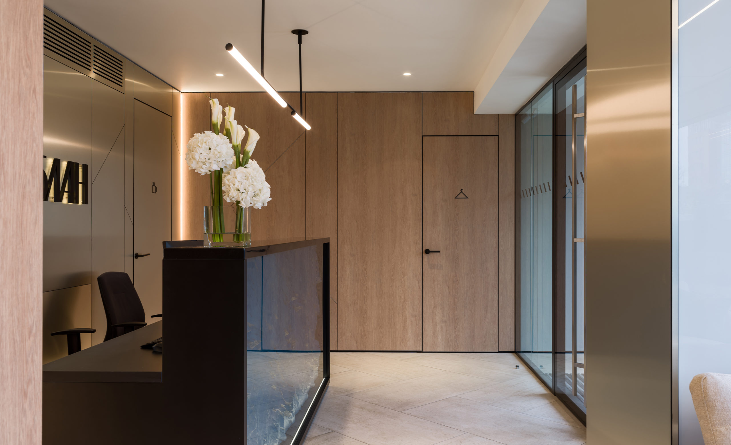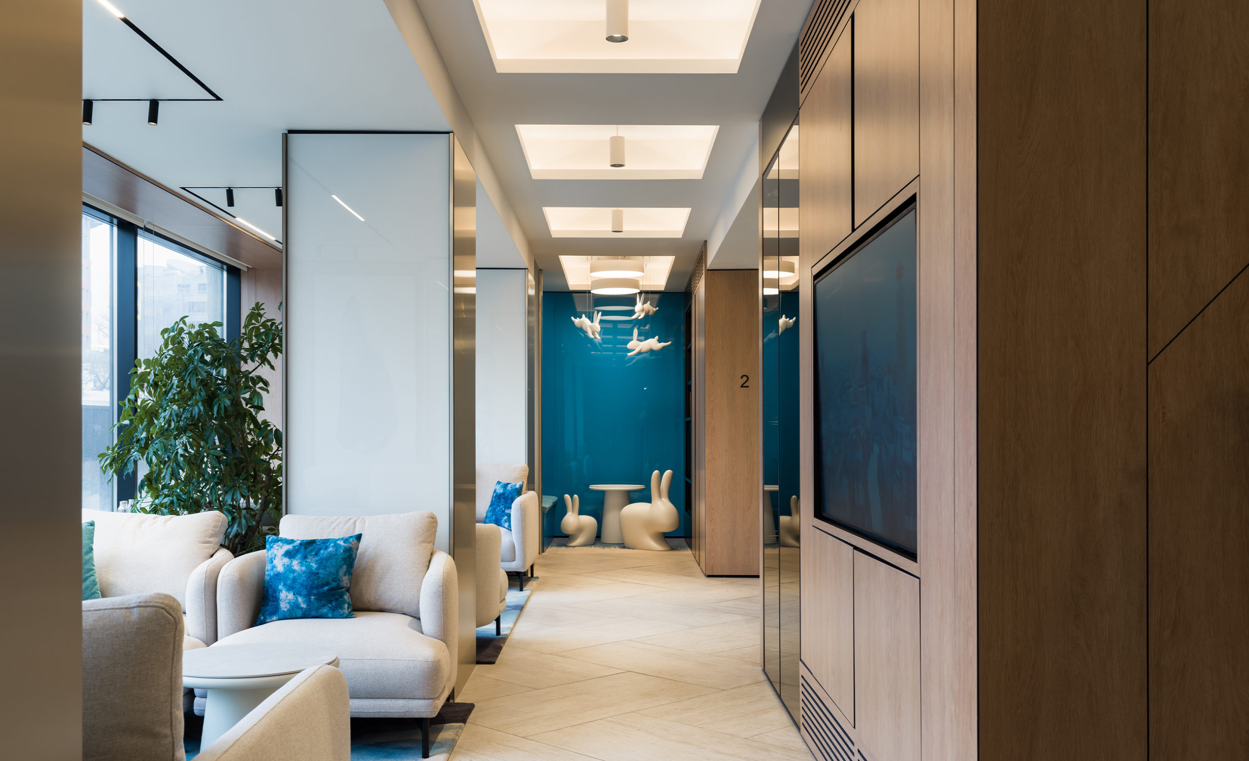 Пространства переговорных решены в нейтральной гамме — со стеновыми панелями под дерево, градиентным ковролином, зеркальной стеной и темной мебелью с покрытием Easytouch , на котором не остаются следы и отпечатки. Кабинеты оснащены всем необходимым для работы с клиентом — комфортным светом — в нескольких сценариях, встроенным тв, включенным в столешницу оборудованием для демонстрации и также декором — постерами с ии-изображениями — отсылками к продуктовой идее жилого комплекса.