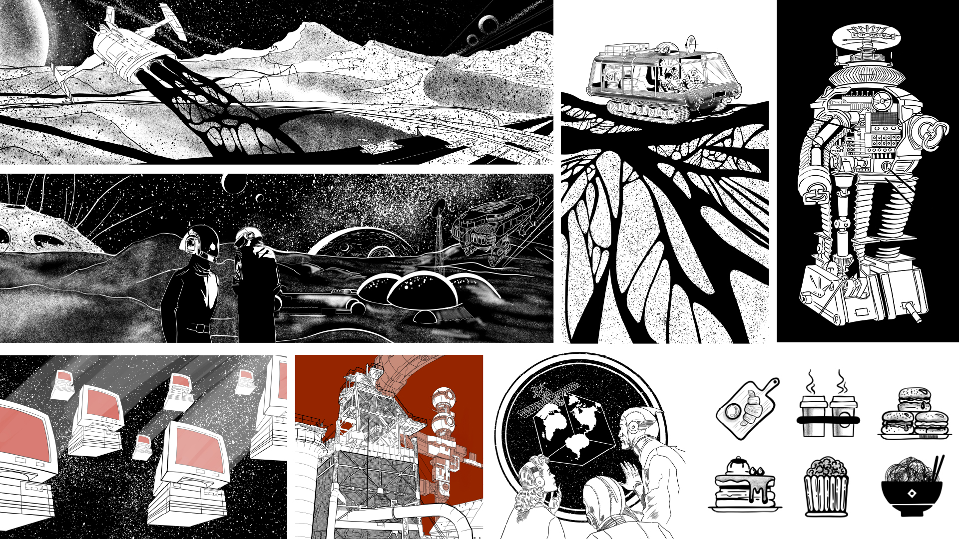 На некоторых стенах расположена авторская графика в стиле ретрофутуризма. Она отражает тематику помещения, играет роль навигации и подчеркивает систему ценностей компании.