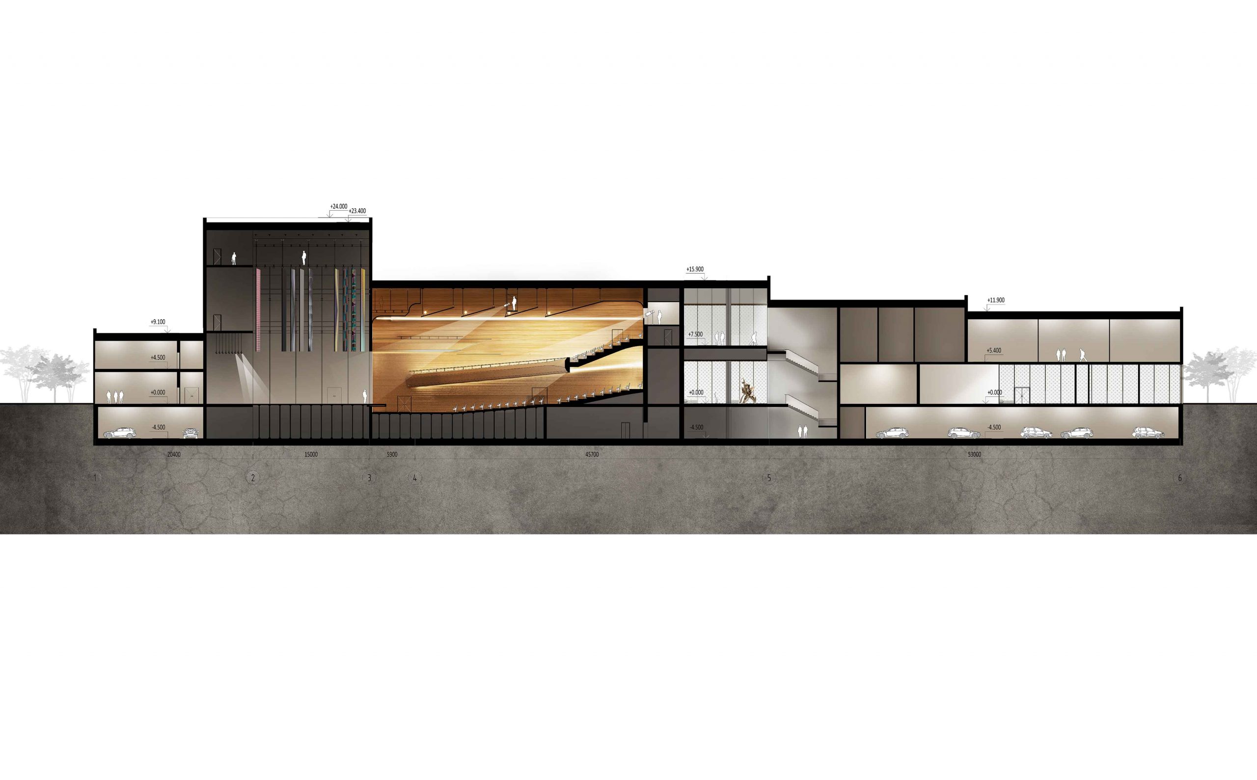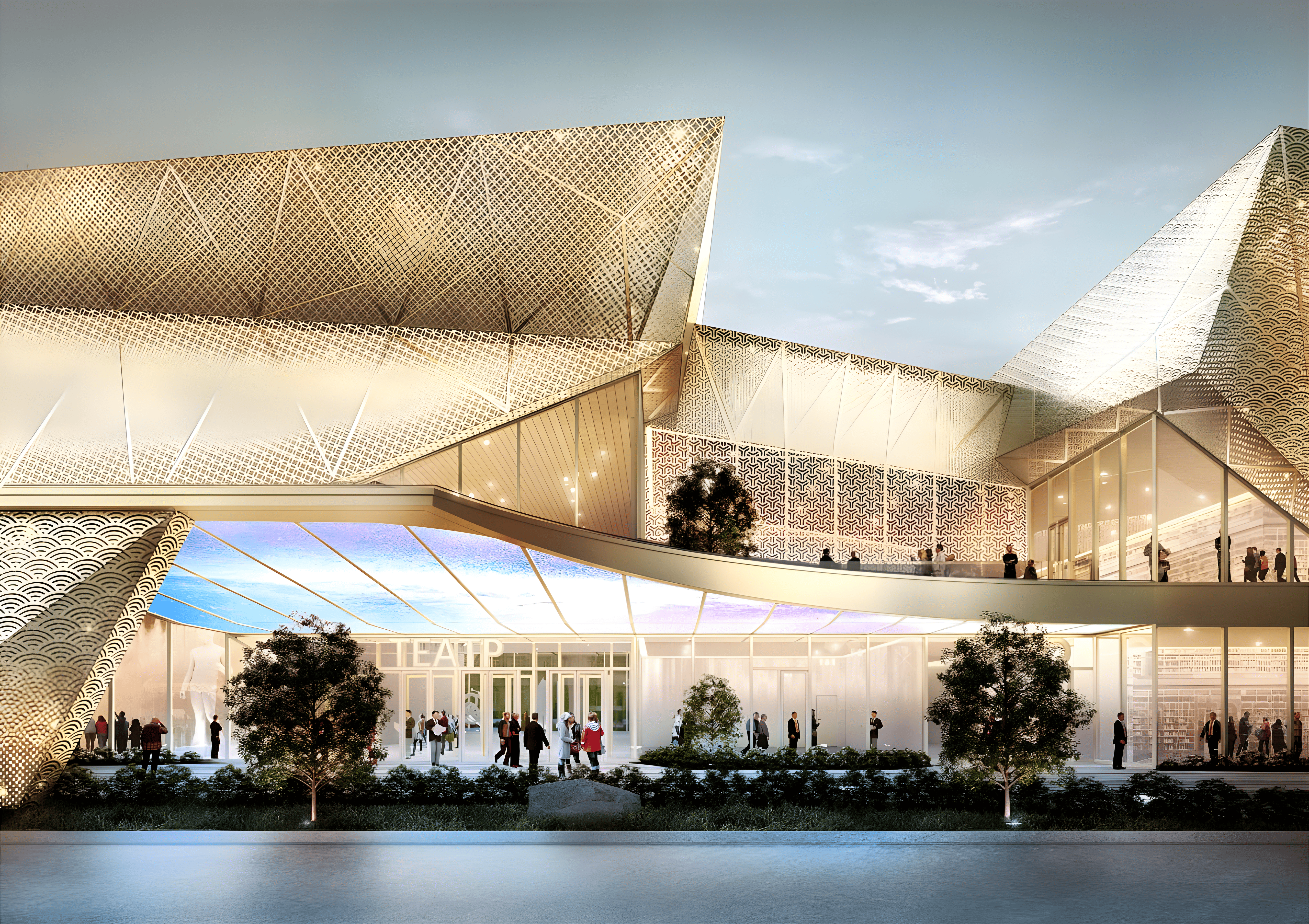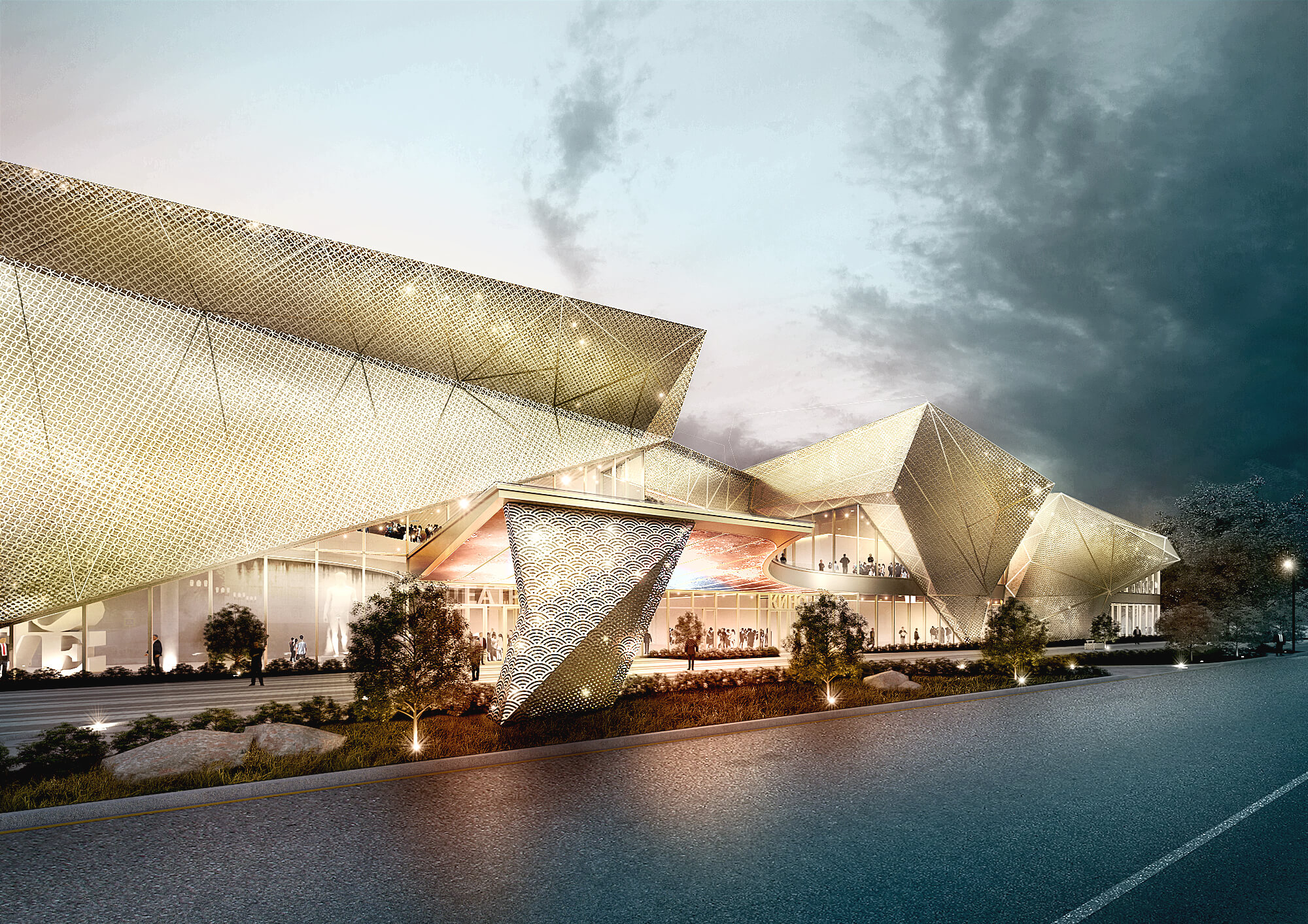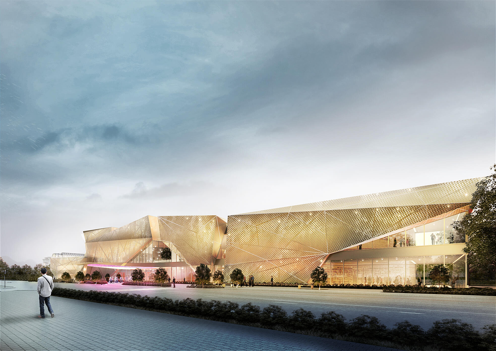 Однако помимо следования за функциональной составляющей динамика фасадов достигается за счет изогнутых ломанных форм фасадных панелей, которые символизируют горный ландшафт Кисловодска. А золотой цвет и воздушность, достигнутая за счет эффекта перфорации, являются отсылками к солнцу, которое можно считать символом города. В дополнение ко всему нам хотелось сохранить преемственность архитектуры, сделать некую метафору на кинотеатр «Россия», на месте которого предполагается строительство культурного центра. Наше внимание привлек узор из золотых колец на фасаде кинотеатра. Именно поэтому перфорация на фасадных панелях культурного центра представляет собой паттерн из кругов и является отсылкой к своему архитектурному предшественнику.