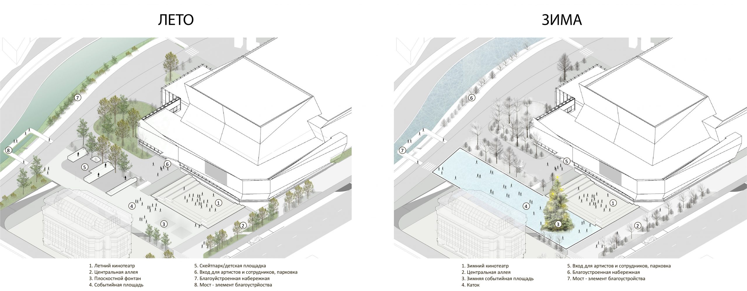 Проектирование культурного центра началось с анализа территории и потребностей людей. Среди запросов жителей Кисловодска были следующие позиции: организованная зона отдыха у воды, благоустроенная площадь, современный скейтпарк, плоскостной фонтан, а также каток в зимнее время. Данные пункты мы учли в эскизном проекте и предложили сценарное использование прилежащей к культурному центру территории.