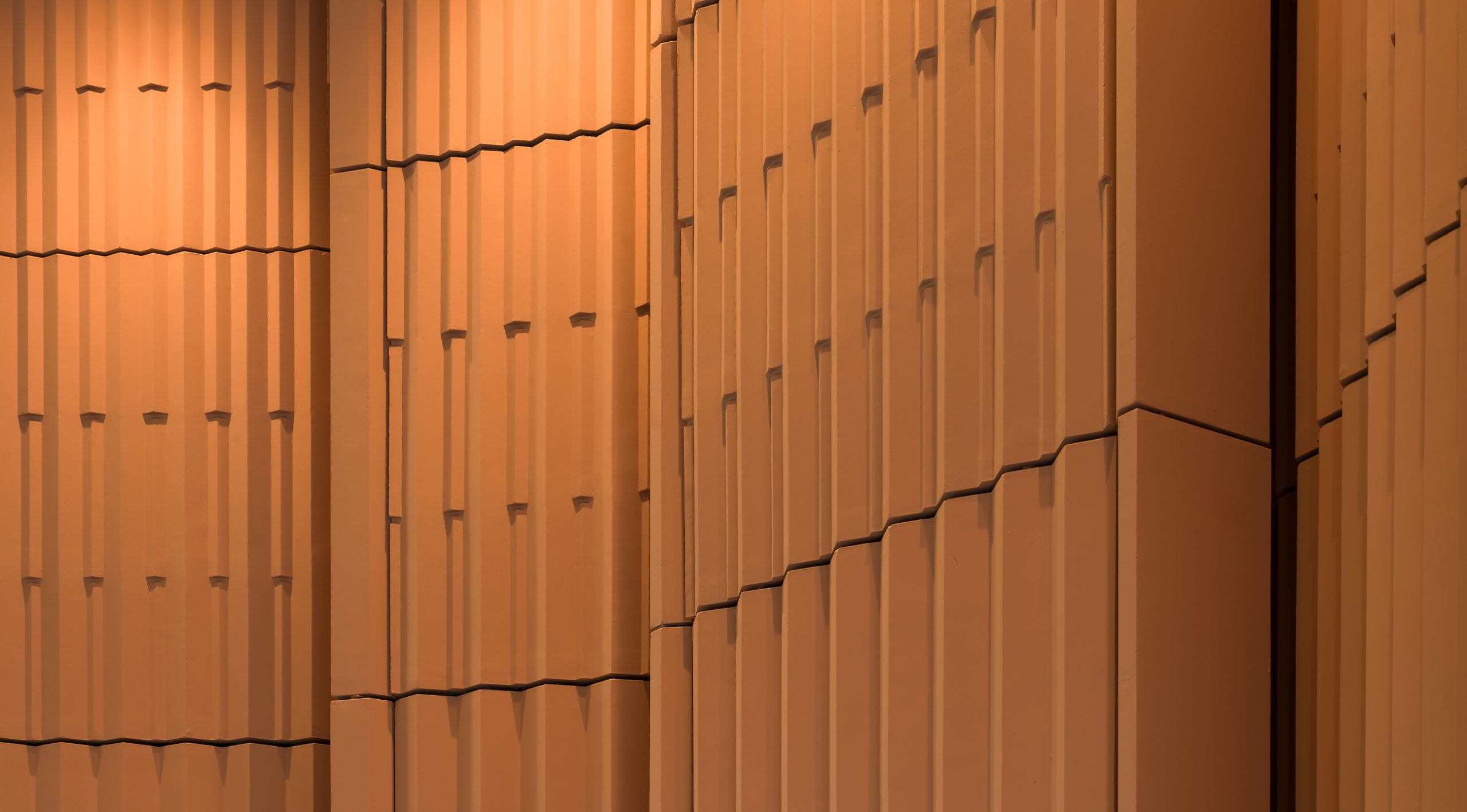 Цветовая гамма вестибюля теплая и спокойная, основным цветом является приглушённый терракотовый, его дополняет теплая текстура дерева и аккуратные акценты металла. Вся отделка решена при помощи керамогранита: на полу применен серый тераццо, на стенах — текстурированный керамогранит под дерево.