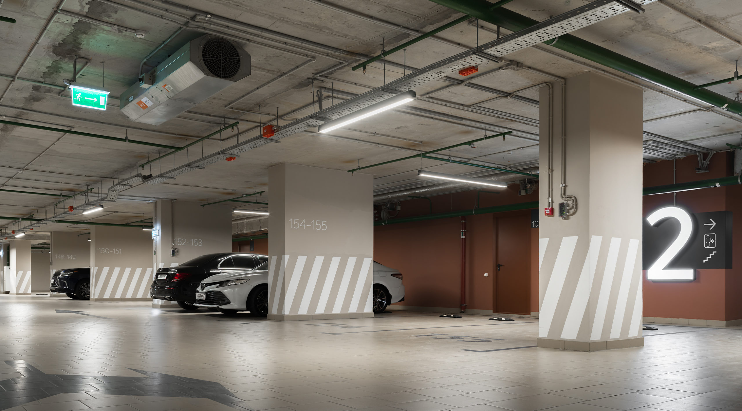 Дизайн подземного паркинга решен в том же ключе, что и остальные пространства комплекса. Приятная цветовая гамма, удобная навигация, долговечное керамическое покрытие пола — все это позволило нам создать благоприятную среду и в этом, казалось бы чисто утилитарном, пространстве.