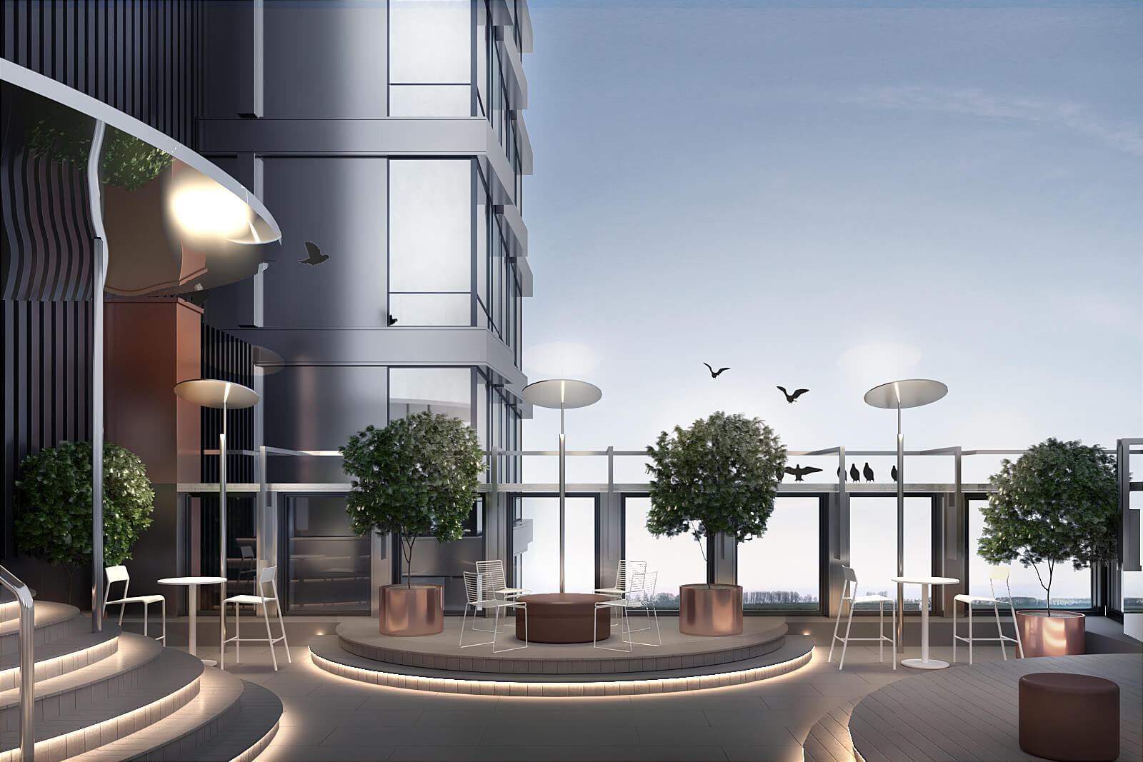 Прекрасным дополнением к набору общественных пространств комплекса стали террасы на кровлях башен. Чтобы создать тут уют, мы применили террасную доску, простую удобную мебель и аккуратное озеленение. Центральным элементом дизайна этого пространства стал амфитеатр и выполненный в металле навес, который защитит от лучей солнца. С навесом перекликаются отражатели уличных светильников, расположенные у парапетов, по периметру террасы, а сами парапеты имеют светопрозрачное заполнение, чтобы жильцы могли любоваться видами города.