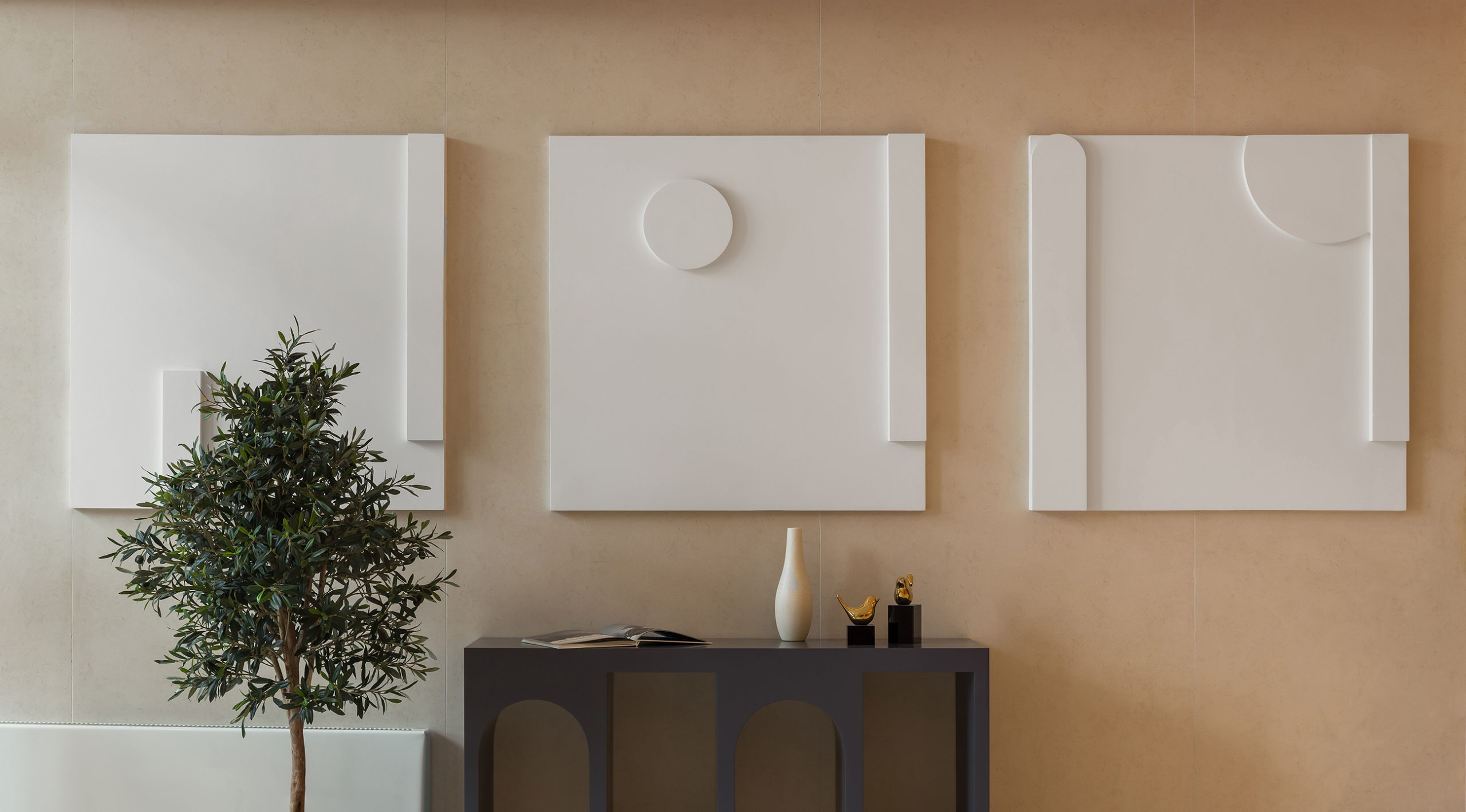 При разработке концепции мы поставили целью создание чистого и светлого впечатления от интерьера. Для этого мы использовали простые формы, светлую гамму, фактуру натурального камня и матовой меди.