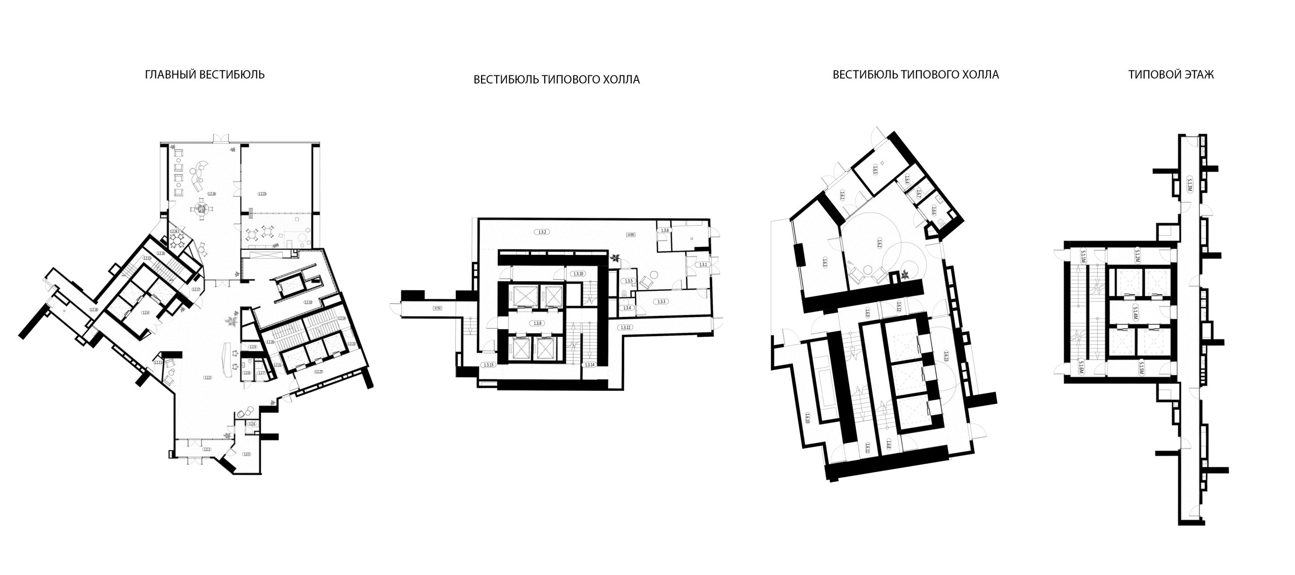 Дизайн типовых этажей мы сделали более простым и минималистичным, но с отсылкой к решениям входных групп. Например, в лифтовом холле мы применили рельефную стену из стеклофибробетона с поэтажной навигацией, а стены украшены рельефными геометричными панно. Также мы применили компланарные двери с отделкой под дерево, с большими дверными порталами, которые мы дополнили аккуратной навигацией из металла.