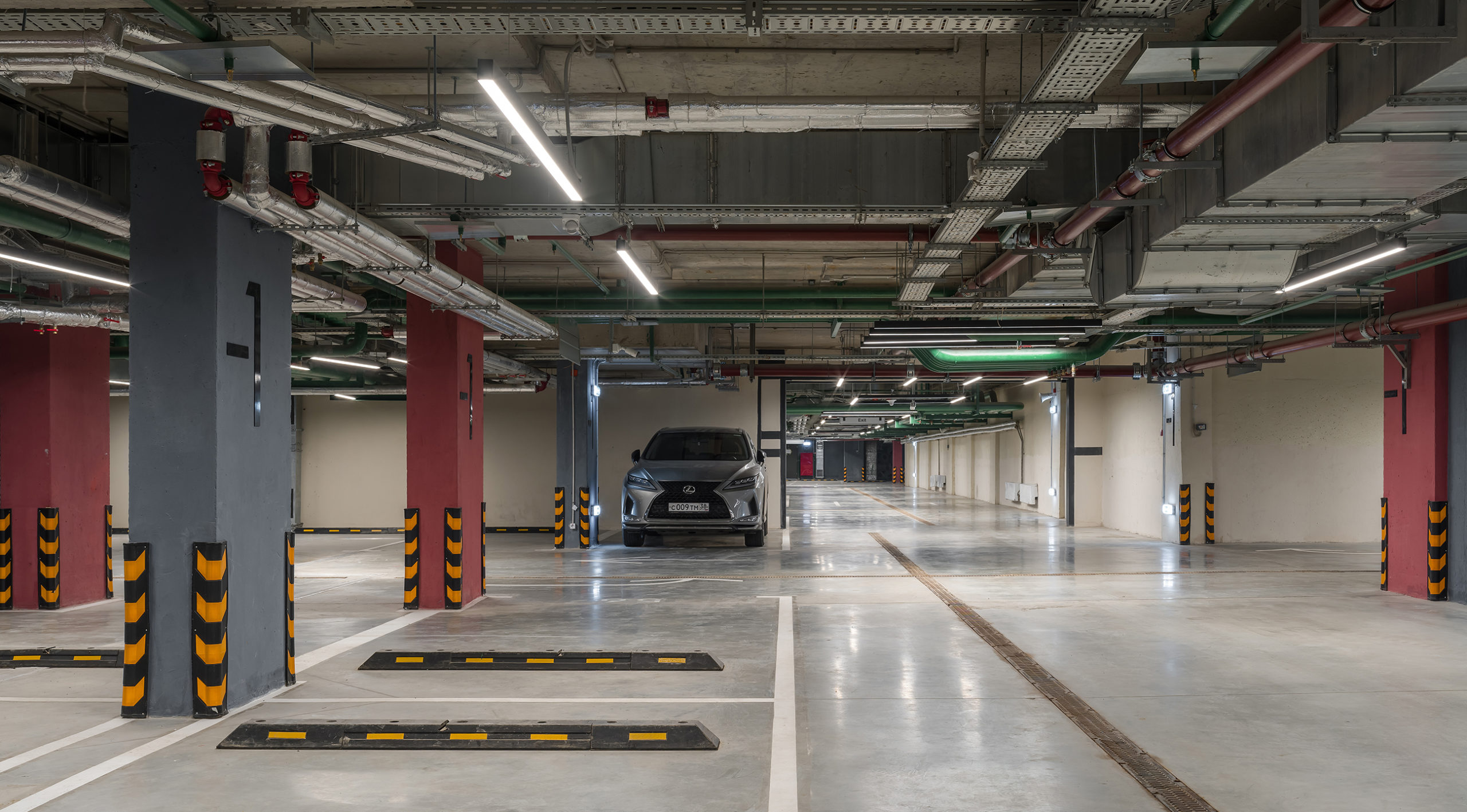 Ни один прогрессивный жилой комплекс не обходится в наше время без подземного паркинга. Сегодня уже очевидно, что эти помещения тоже нуждаются в качественном дизайне. Оформление этой зоны мы увязали со стилистикой остальных зон, но придали ей более техногенный характер. Антрацитовый потолок в сочетании с необычно расположенными линейными светильниками, а также тёмно-терракотовые колонны создают ощущение мягкости, обычно не свойственное таким помещениям. Лестнично-лифтовые узлы мы выделили цветом и навигацией для удобства ориентации, а пол оставили светлым, выделив на нём разметку тёмным цветом.