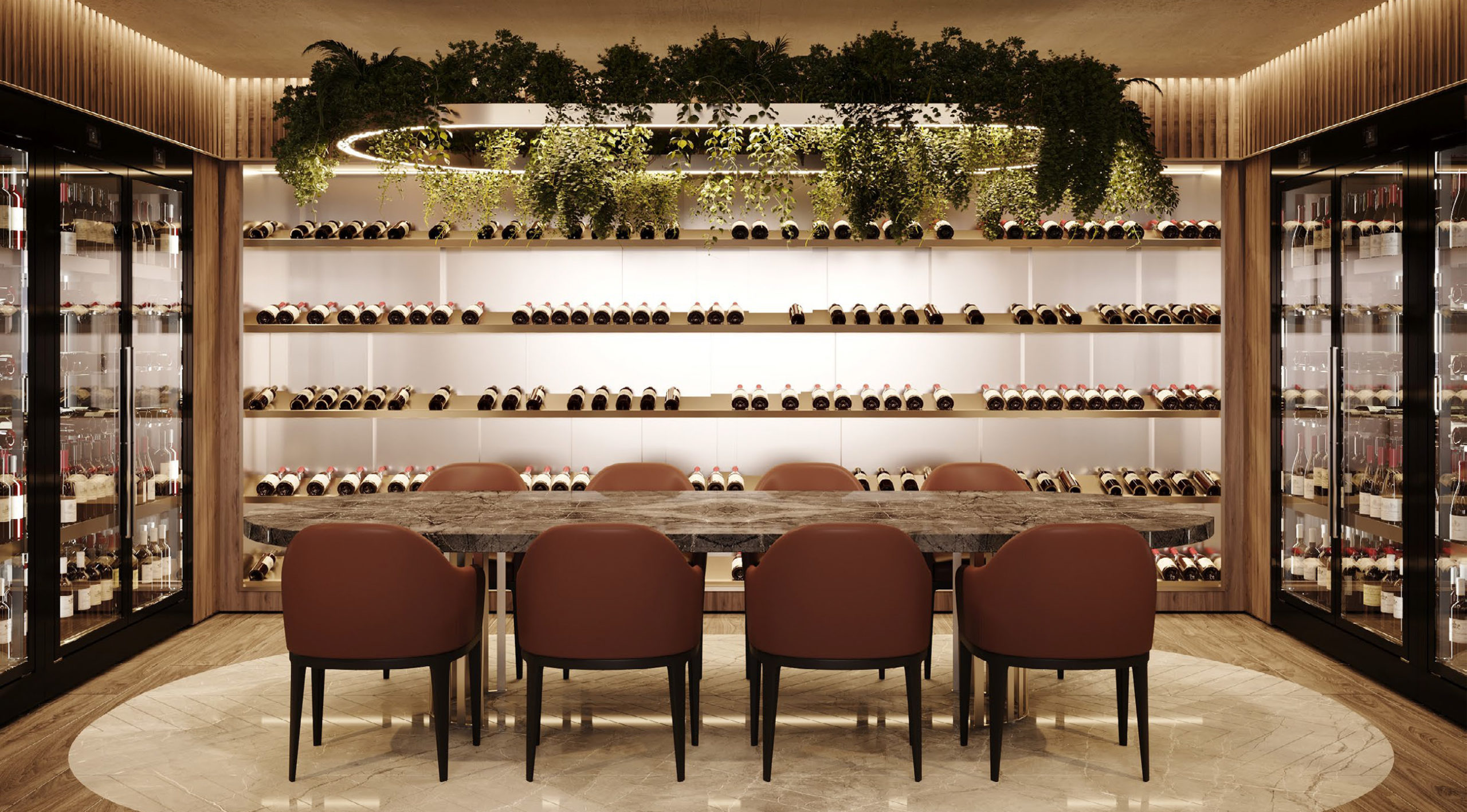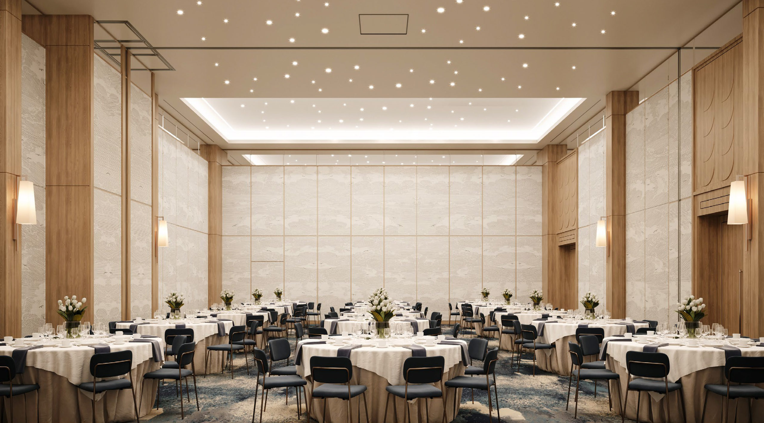 Баллрум — торжественная зона мероприятий, выполненная в классической светлой гамме с добавлением деревянных вставок. Панельные элементы на стенах имеют аккуратную гравировку с рисунком пейзажа — что дает пространству универсальность, монотонность и подчеркивает его возможность в переоформление и декорацию в подходящий формат мероприятия.