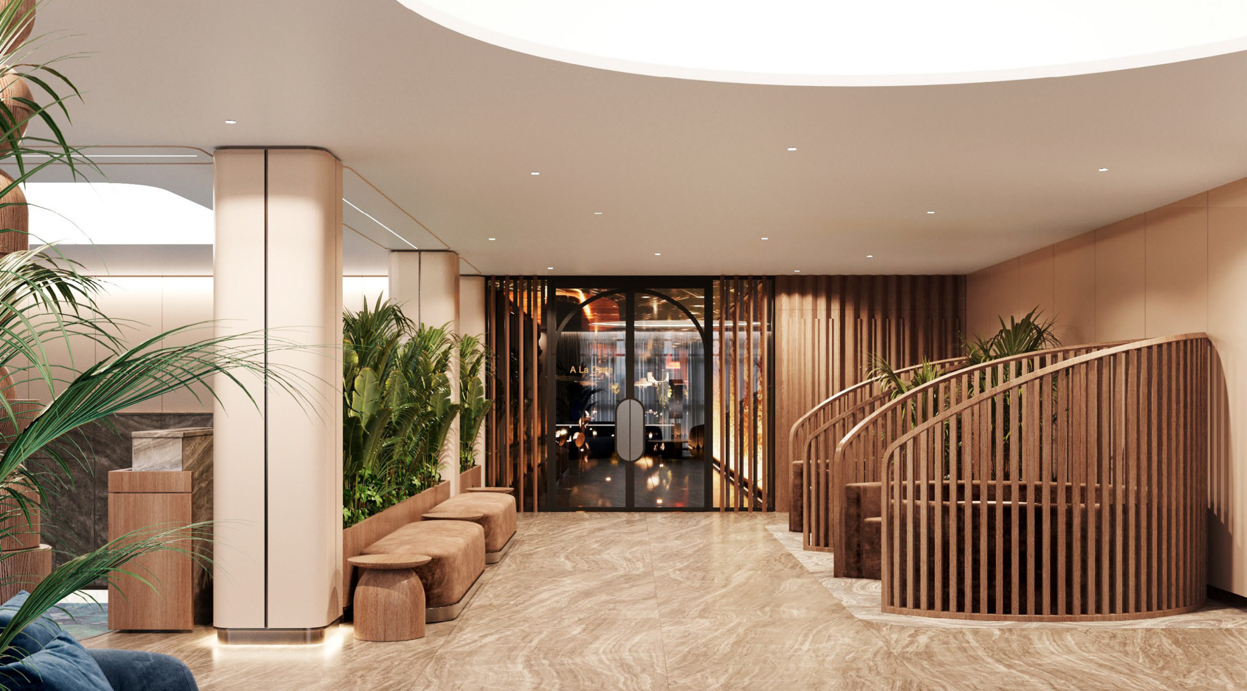 Геометрия основного лобби распространяется на все дополнительные пространства на первом этаже: чешуйчатые деревянные стены становятся металлическими в лифте, а бусины-перегородки преобразовываются в функциональный декор.