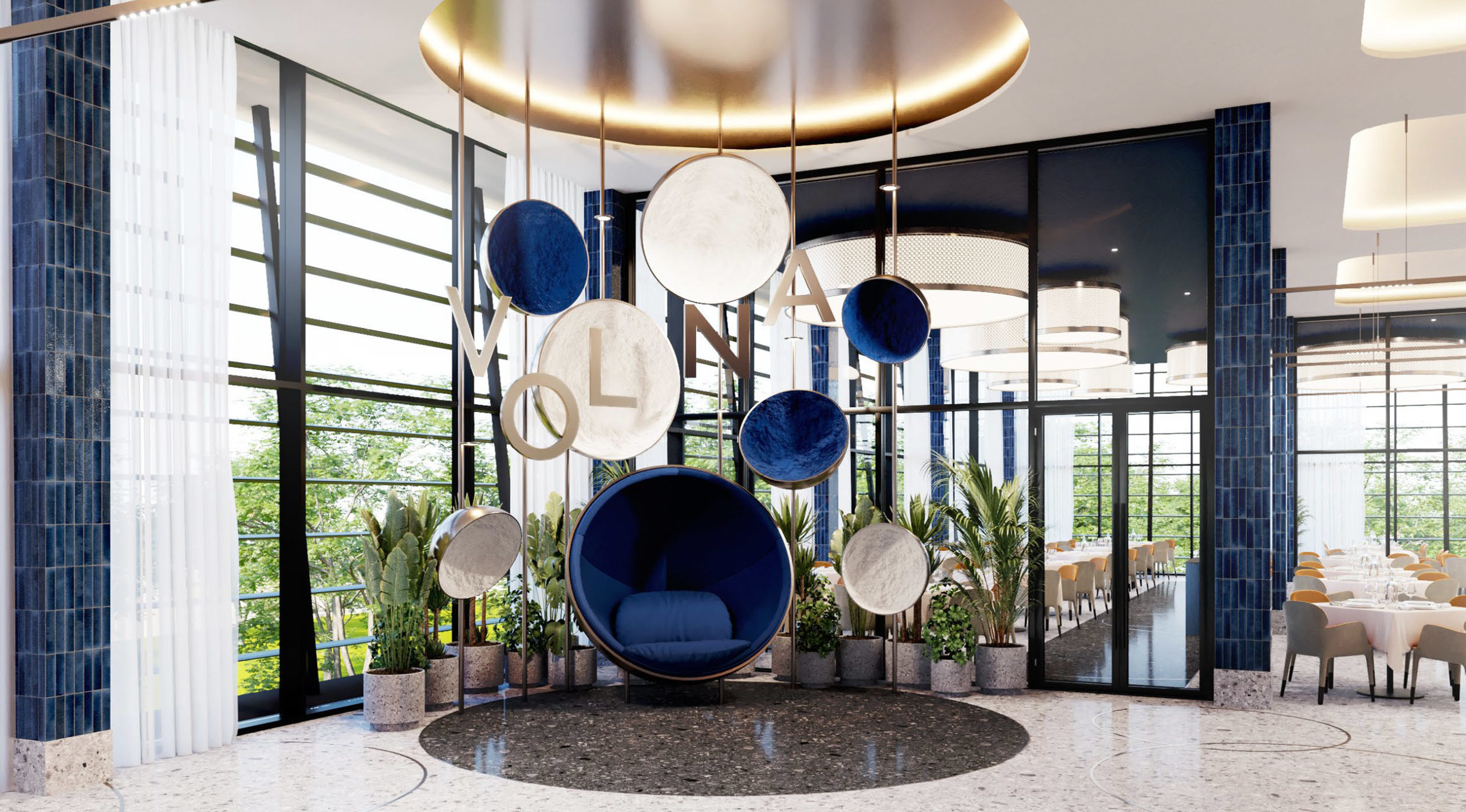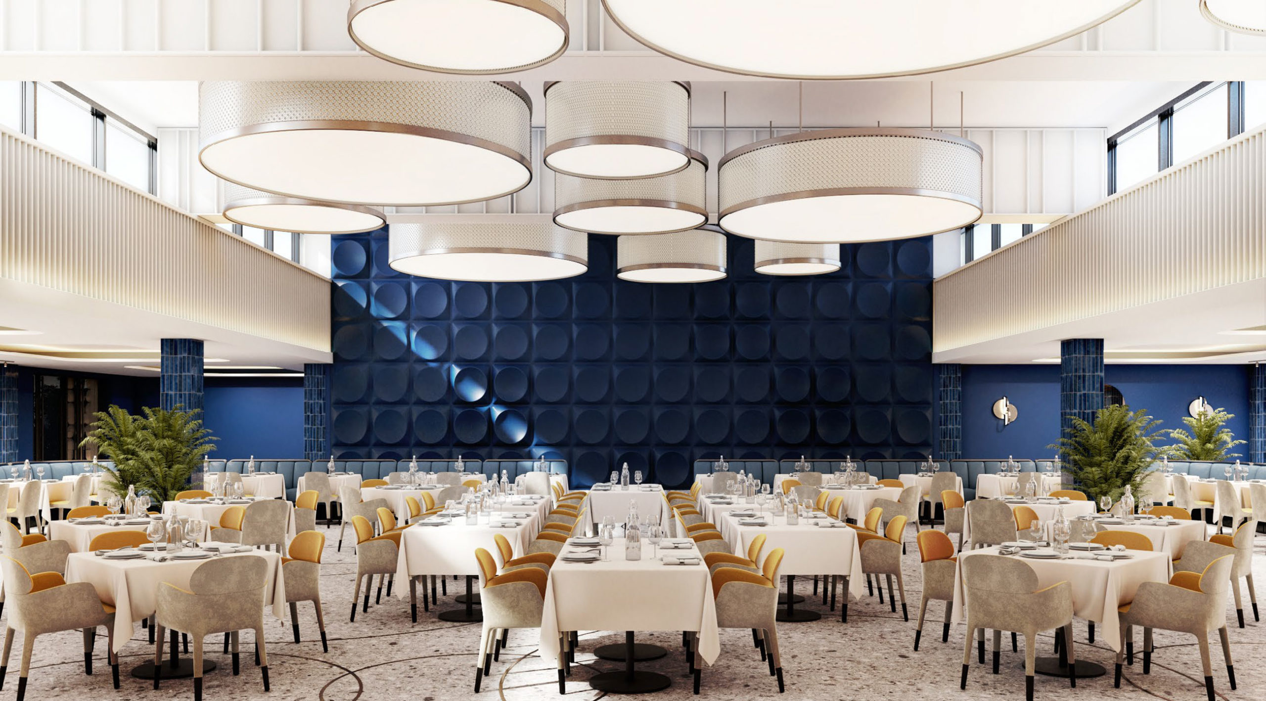 Общественный ресторан — обеденная зона, рассчитанная на большой поток посетителей в течение дня. За основу также был взят особый, яркий синий цвет в сочетании с бело-золотистыми оттенками.