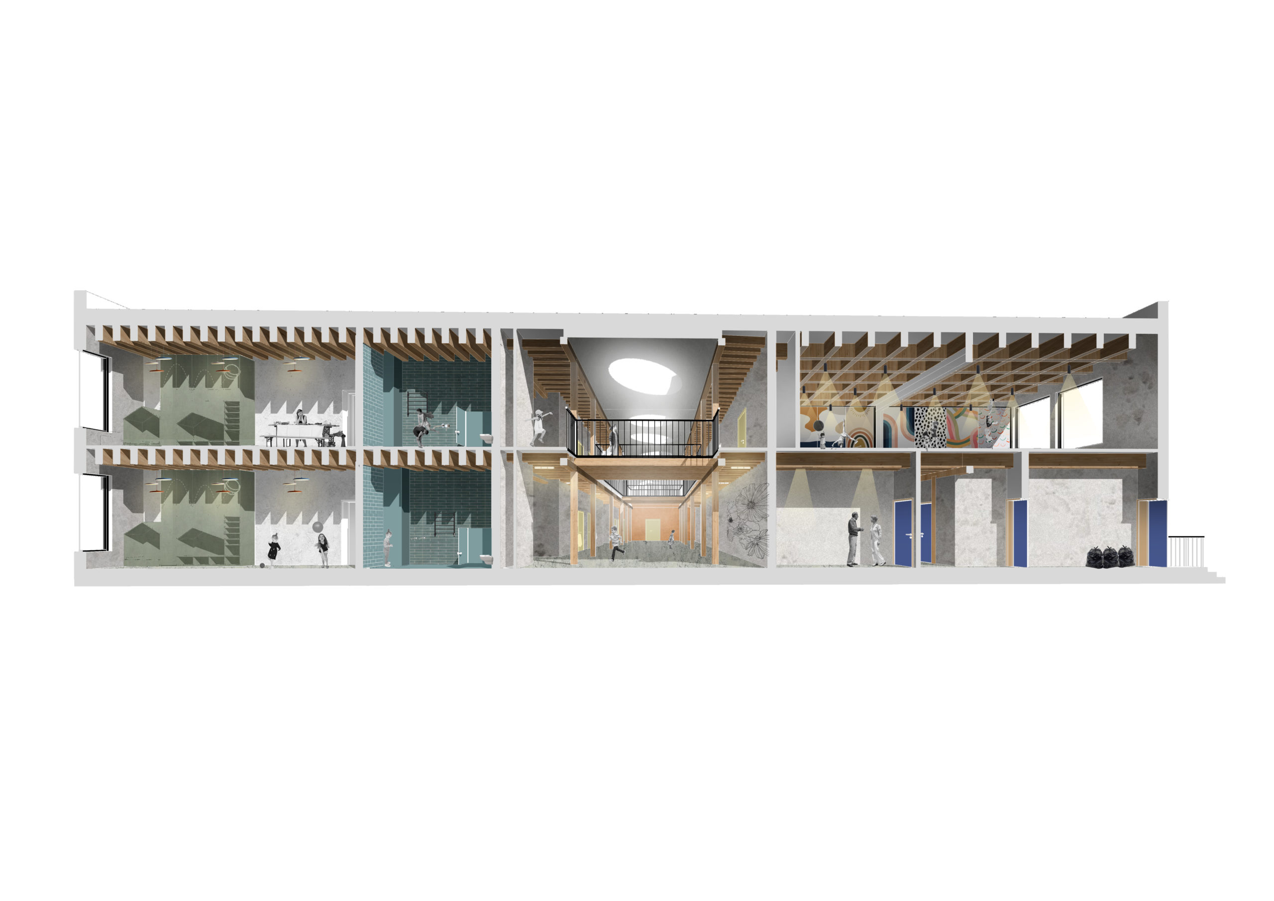 В основе планировочного решения лежит использование унифицированной групповой ячейки и двусветного игрового холла с естественным освещением через зенитные фонари.